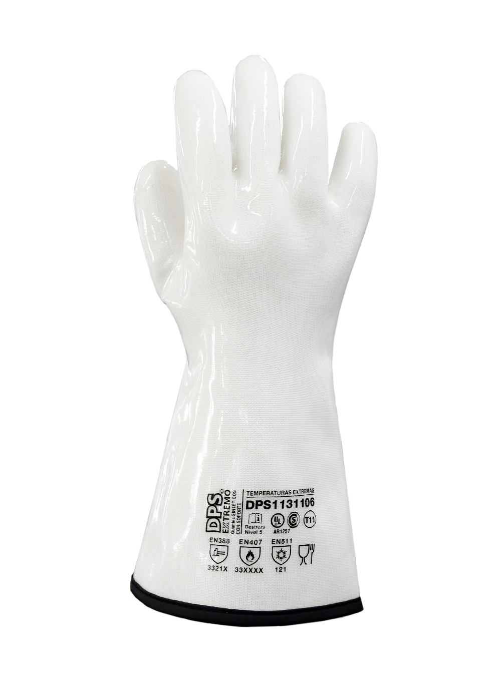 Para temperatura de – 40°C recomendamos usar DPS114324 Guante de fibra acrílica con baño completo de PU- CRIOGENICO.